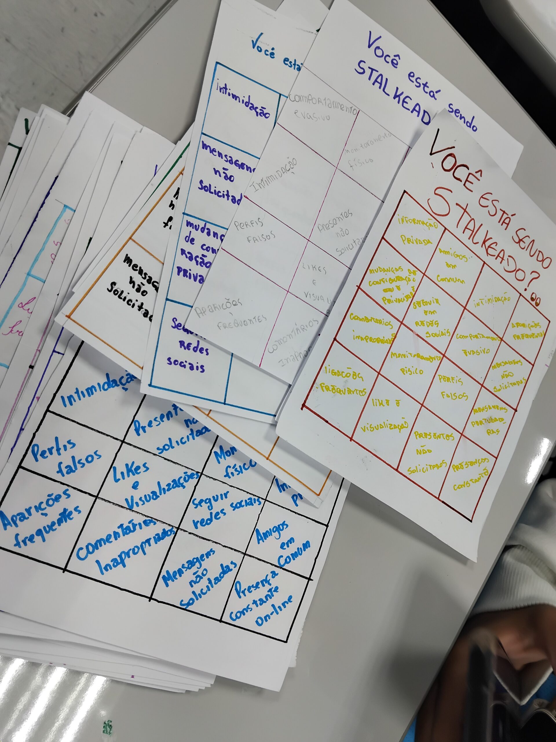 Conforme o conteúdo e metodologia proposta em 2024 foi possível perceber que fizemos uma ampla discussão sobre machismo, patriarcado e os tipos de violência contra às mulheres e, sentimos a necessidade de ir além do básico, aprofundando em conteúdos como o Stalking e Crimes Virtuais, pois para além de modalidades novas de crimes, os aprendizes podem estar mais suscetíveis a passar por esses crimes, pois utilizam muitas horas do dia se comunicando e também se relacionando com outras pessoas por meio digital. E isso fica evidente, pois perguntamos sobre o tema e o quanto viam deste conteúdo em redes sociais: